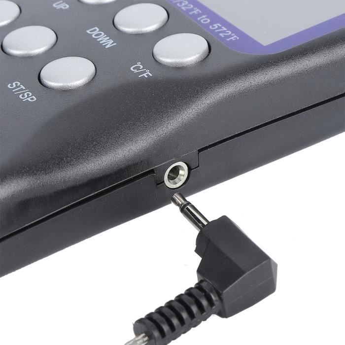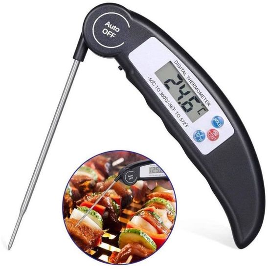 Pour cuisiner comme un pro, ce thermomètre numérique avec sonde est indispensable ! Il mesure les températures de 0 à 300°C avec une précision de ±1 à 3°C. La sonde pliable (câble de 1 m) vous évite de vous brûler. Il a aussi une fonction minuterie compte à rebours (jusqu'à 23h59) et une alarme qui sonne quand la température cible est atteinte. Parfait pour faire du sucre cuit, des macarons, surveiller la cuisson de la viande au barbecue, ou utiliser au four. L'écran LCD affiche la température et l'heure. Fonctionne avec 2 piles AAA (non incluses). Dimensions : environ 14,5 x 7 x 3 cm. Un outil polyvalent, simple à utiliser, pour réussir toutes vos recettes à coup sûr !