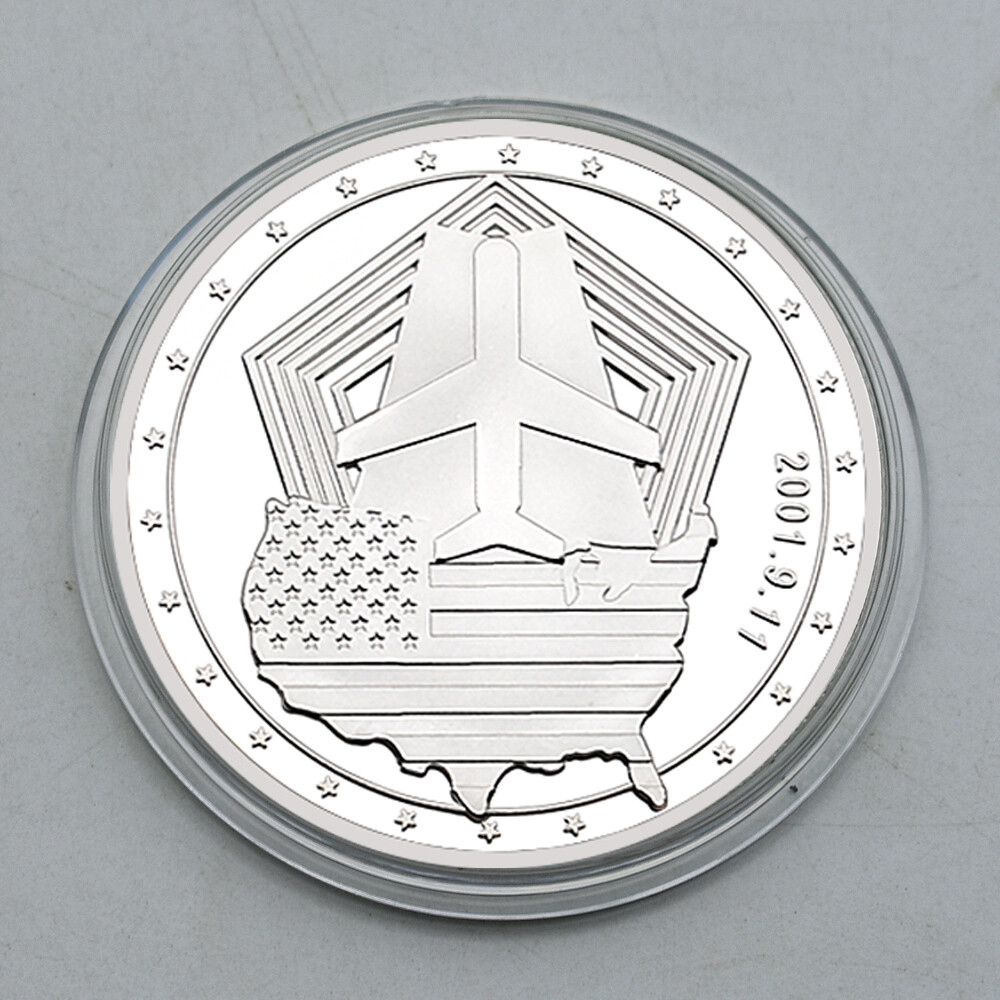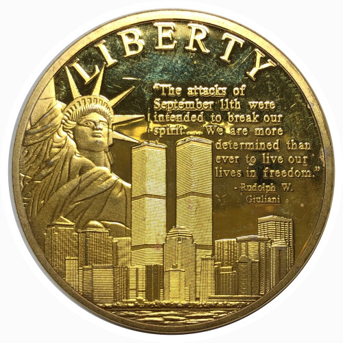 Cette pièce commémorative rend hommage aux événements du 11 septembre 2001. En métal, avec l’inscription “Liberty and Justice for All”, elle symbolise la résilience et les valeurs américaines.