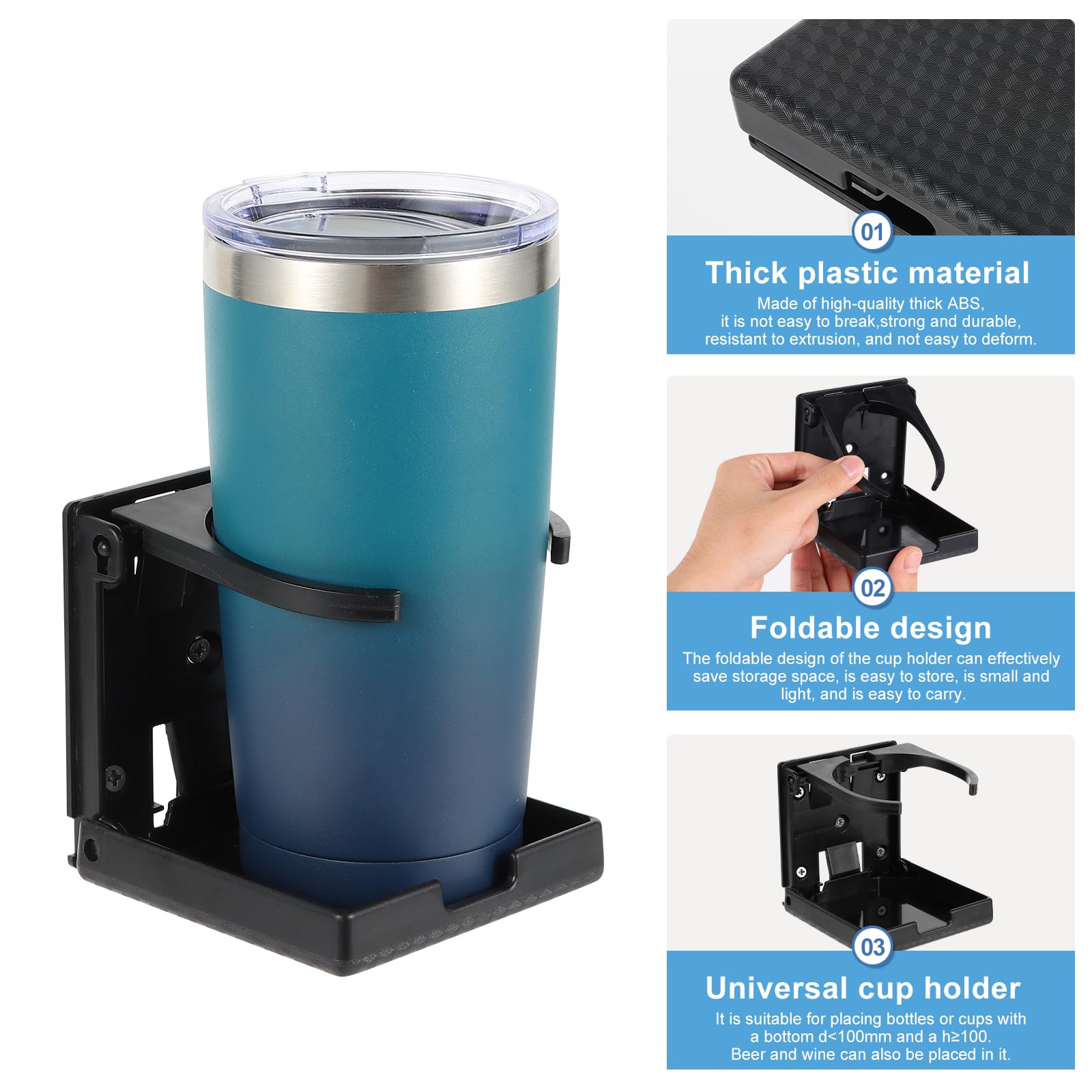 Vous en avez marre des gobelets qui se renversent en voiture ? Ce lot de 2 porte-gobelets est la solution ! En plastique ABS robuste et résistant aux UV, ils s'adaptent à presque toutes les boissons : gobelets, canettes, bouteilles jusqu'à 100 mm de diamètre. Le top ? Ils sont pliables : dépliés, ils mesurent 9,5 cm de haut ; pliés, seulement 2,3 cm ! Vous gagnez un max de place. L'installation est simple (10 vis fournies), sur n'importe quelle surface plane en voiture, fourgon, camping-car ou même bateau. Fixez-les près du siège, sur un mur... Fini les risques de renversement, bonjour les trajets tranquilles !