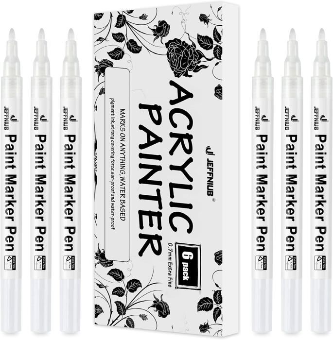 Hey les créatifs ! Ce pack de 20 marqueurs blancs permanents de 3.0 mm est parfait pour customiser à peu près tout : verre, bois, céramique, toile, métal, pierres, œufs de Pâques, décorations de Noël... L'encre acrylique est opaque, résistante à l'eau une fois sèche, et ne décolore pas. Secoue le stylo avant usage, appuie sur la pointe pour faire couler l'encre, et laisse sécher. Idéal pour les DIY, les loisirs créatifs, les étiquettes ou les petits messages. Attention : ne convient pas aux moins de 3 ans (risque d'ingestion). Referme bien le capuchon après usage et stocke à l'horizontal. Un must-have pour tes projets artistiques ou pour personnaliser des cadeaux. Amuse-toi bien !