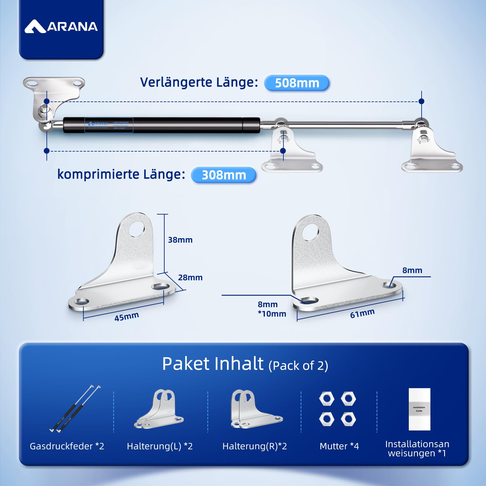 Amortisseur Pour Meuble TV Amortisseurs à Gaz 635mm 534N (54.4kg) - Lot De 2 Avec Supports En L - Pour Meuble TV, Auvent, Porte De Sous-sol, Coffre Arana Verins