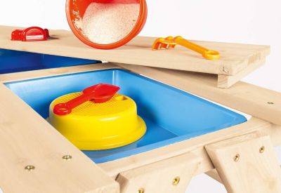 De l'autre côté, c'est un bac à sable surélevé pour les enfants (à partir de 3 ans). Ils peuvent jouer debout ou assis, construire des châteaux, creuser, laisser libre cours à leur imagination, sans que le sable se répande partout. La table est livrée avec un voile de jardin pour le fond et un couvercle (non mentionné mais souvent inclus) pour protéger le sable ou la terre.