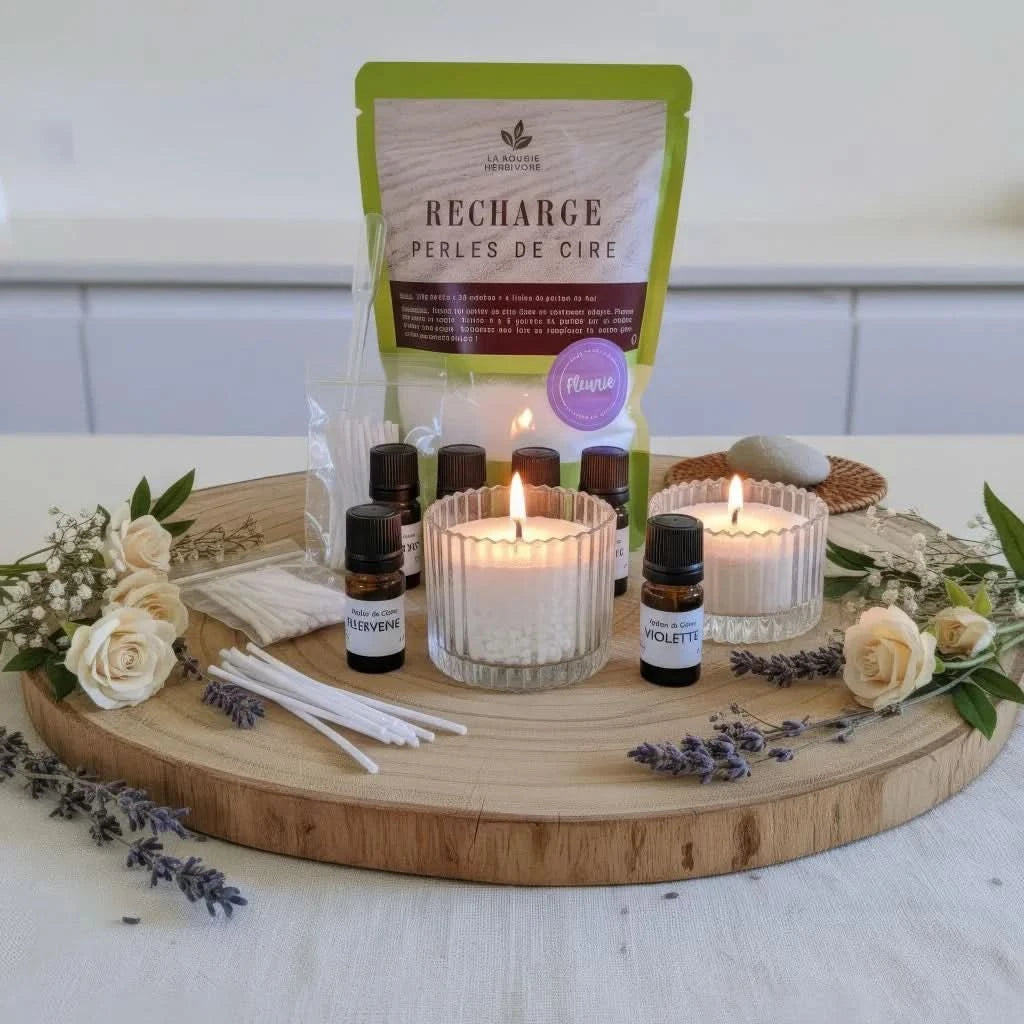 Tu aimes les activités manuelles et les ambiances cosy ? 🕯️ Ce kit de fabrication de bougies en cire perlée est fait pour toi ! C’est simple, écologique, et le résultat est super joli.\n\n✨ Contenu : 1 kg de perles de cire végétale (donc sans paraffine pétrochimique, plus sain et durable), 20 mèches de coton, et 2 bâtons de Palo Santo pour purifier l’air et ajouter une touche spirituelle.\n\n🎨 Comment ça marche ? Tu n’as même pas besoin de faire fondre la cire ! Tu verses juste les perles dans un récipient transparent (verre, pot…), tu insères la mèche au centre, et c’est fini. Les perles tiennent entre elles, la bougie est prête à être allumée.\n\n🌿 Avantages écolos : cire d’origine végétale, emballage en papier kraft, pas de produits toxiques. Les bougies brûlent proprement, sans fumée noire ni odeur chimique.\n