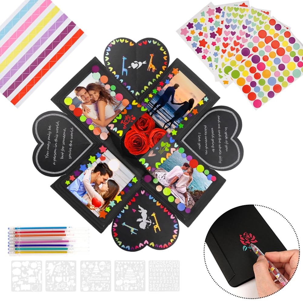 Surprenez vos projets pour leur anniversaire avec cette boîte cadeau à explosion ! Le kit contient tout pour créer un moment magique : 10 boîtes pop-up non montées (7,5 cm de côté), une belle boîte extérieure décorative (10 x 7,5 x 18,5 cm), une ceinture et un sac de transport. Le design est élégant en noir et doré, parfait pour un cadeau chic et personnalisé. Le principe est simple : vous montez facilement les petites boîtes, vous y glissez de l'argent, un petit bijou, un message, des photos, ou des bonbons, et vous les placez dans la grande boîte. Quand la personne l'ouvre, les petites boîtes 'explosent' et s'ouvrent en cadeau, c'est super impressionnant et joyeux ! C'est une activité DIY amusante à faire seul ou en famille. Idéal pour un cadeau d'anniversaire, mais aussi pour la Saint-Valentin, Noël, ou un mariage. Les boîtes sont en papier de qualité, résistant. Attention, à cause de la sensibilité du papier, les couleurs peuvent légèrement varier, et il vaut mieux ne pas les laisser pliées trop longtemps avant de les utiliser pour garder leur élasticité. Un cadeau qui marquera les esprits à coup sûr !