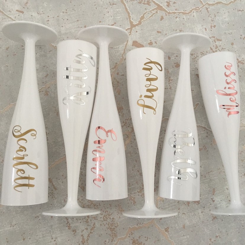 Organisez un enterrement de vie de jeune fille, une fête d'anniversaire ou une soirée entre filles ? Ces flûtes à champagne en plastique blanc personnalisables vont rendre l'événement encore plus spécial et mémorable. En plastique polycarbonate de bonne qualité, elles sont incassables (donc parfaites pour les piscines, les jacuzzis, les pique-niques ou les voyages), légères et hautes de 22 cm. Vous pouvez y faire graver les noms des demoiselles d'honneur, celui de la mariée, ou une date. C'est un cadeau super sympa que les invitées pourront ramener en souvenir. Elles ont l'air classe comme du vrai verre, mais sans le risque de casse. Idéales pour les toasts, les photos de groupe, ou simplement pour siroter son champagne en rigolant. Pensez-y pour ajouter une petite touche personnelle et élégante à n'importe quelle célébration. Un must-have pour une fête réussie !