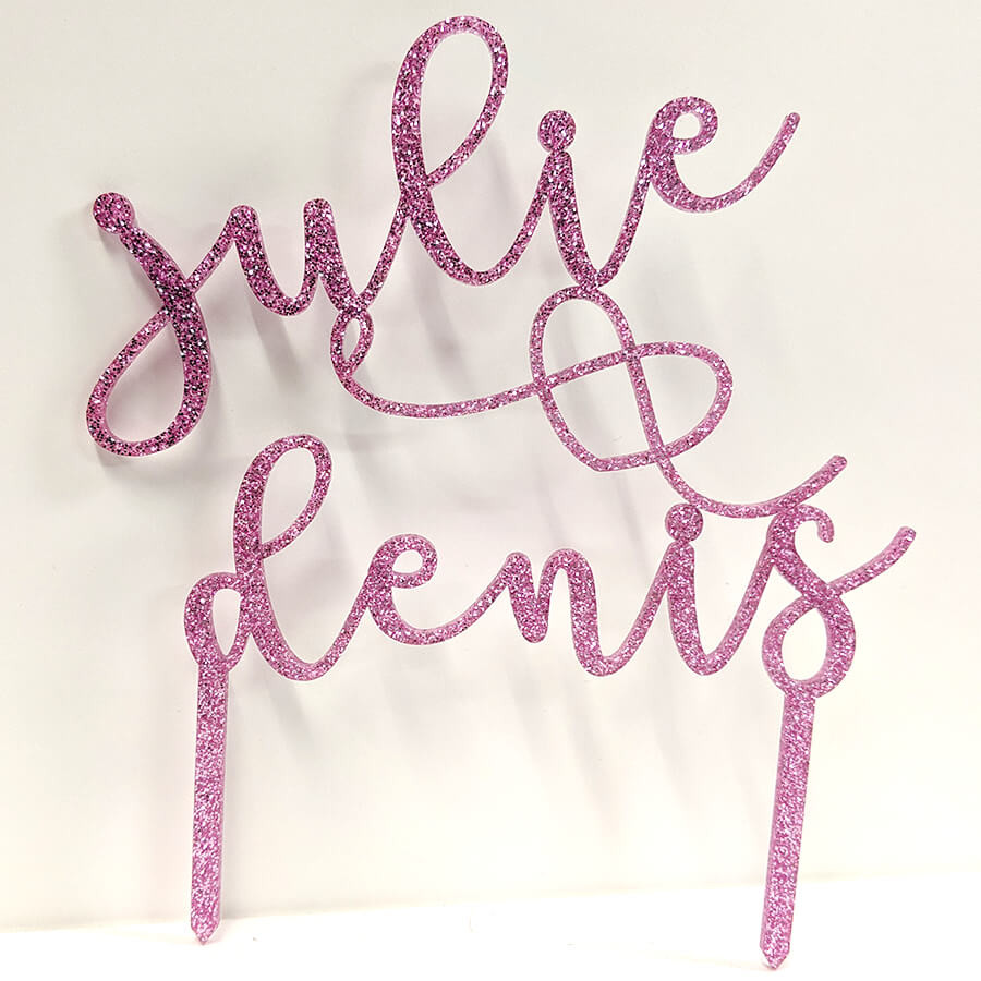 Pour un gâteau de mariage, d'anniversaire ou de baptême qui a de la personnalité, ce topper en acrylique personnalisé avec les prénoms du couple (ou tout autre texte) est parfait ! Il est disponible en plusieurs couleurs : or, argent, rose gold, noir, bleu, violet, etc., et en trois tailles : S (12 cm), M (15 cm), L (18 cm) de large. Tu choisis la couleur et la taille en fonction de ton gâteau.