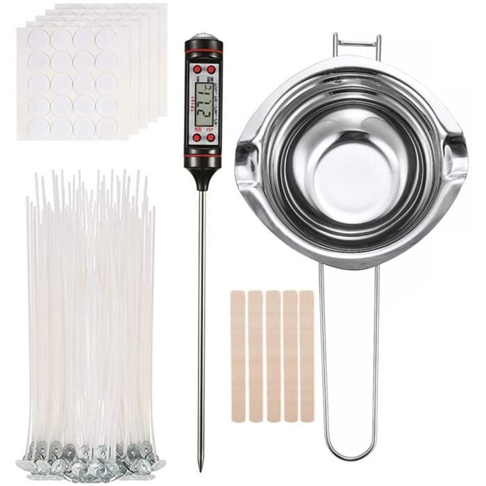 Coucou les créatifs et les amateurs de bougies maison ! Ce kit complet de fabrication de bougies, c'est tout ce qu'il vous faut pour vous lancer dans la confection de bougies personnalisées. Il contient : un rouleau de mèche en coton de 61 mètres (à couper à la longueur souhaitée), 100 supports de mèche, 100 autocollants double face résistant à la chaleur pour fixer la mèche, 10 supports en bois, 3 supports en métal, un pot fondeur en inox de 400 ml (super pour faire fondre la cire au bain-marie, et aussi pour le caramel ou le beurre !), et une cuillère à mélanger. La mèche ne fume pas à la combustion, et les accessoires sont de bonne qualité. Idéal pour réaliser des bougies en pots, en verre, en formes... pour vous, pour offrir (Noël, anniversaire, Saint-Valentin...), ou pour une activité manuelle relaxante. Tout est réuni pour que vous puissiez exprimer votre créativité et parfumer votre intérieur avec vos propres créations. À vous les soirées cocooning lumière chandelle !