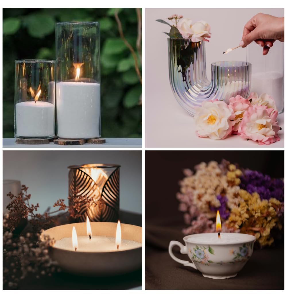 La magie ? Vous pouvez utiliser n’importe quel récipient – vase, pot, coquillage – et même faire flotter la bougie sur l’eau. La cire ne se consume pas comme une bougie classique : quand elle a fini de brûler, il suffit de changer la mèche pour la réutiliser. Économique et écolo !