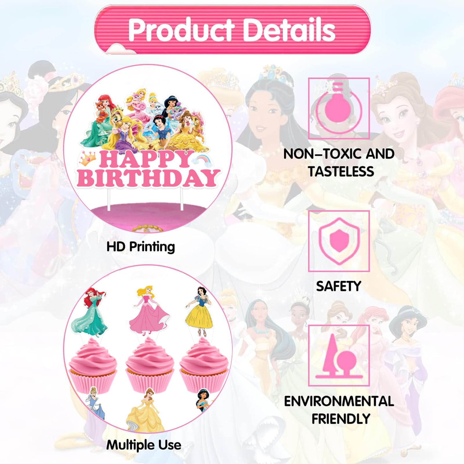 Pour un anniversaire de petite fille qui rêve de princesses, ce set de 31 décorations va transformer le gâteau en un véritable château enchanté ! Le kit comprend une grande décoration \Joyeux anniversaire\ (14x15 cm) et 30 petits toppers avec des motifs de couronnes, châteaux et baguettes magiques – parfaits pour les cupcakes ou le gâteau principal. En carton épais de qualité alimentaire, ces décorations sont sans danger pour les enfants et résistantes. Elles se plantent facilement dans la crème ou le fondant, sans colle ni ruban. Les couleurs vives et les motifs adorables plaisent à coup sûr aux petites princesses. Tu peux aussi t’en servir pour décorer le buffet, emballer les cadeaux ou créer une guirlande. Un must pour les fêtes d’anniversaire, les baptêmes ou même une journée spéciale à l’école. Prête à faire scintiller les yeux des enfants ?