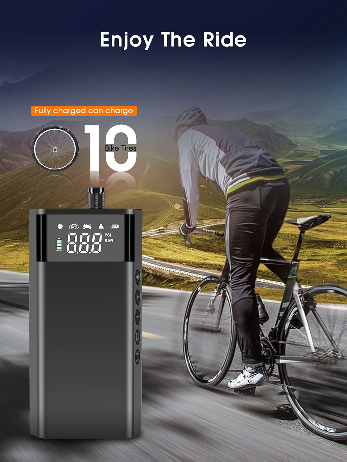 Fini les pompes à main qui vous essoufflent au bout de deux pneus ! Cette pompe à air électrique portable est un petit bijou de technologie pour les cyclistes, mais aussi pour gonfler les ballons, les jouets de plage, les pneus de voiture en dépannage, etc.\n\nElle est sans fil, avec une batterie rechargeable intégrée de 2x2000 mAh (via USB-C, câble souvent fourni). Une charge vous donne jusqu'à 30 minutes d'autonomie. En plus, elle peut servir de power bank pour recharger votre téléphone en urgence – malin !\n\nElle est super simple à utiliser : 4 modes prédéfinis (balle, vélo, moto, voiture) où elle s'arrête automatiquement à la pression idéale. Un mode manuel vous permet aussi de choisir précisément la pression désirée entre 3 et 150 PSI. L'écran LCD montre la pression en temps réel.\n\nLa pression max est de 150 PSI (10.3 bars), donc largement assez pour un vélo de route. Elle est livrée avec plusieurs embouts. Elle a même une petite LED pour éclairer si vous devez gonfler dans le noir, et une fonction pour dégonfler.\n\nCompacte, légère, elle se glisse dans un sac à dos ou dans la voiture. Un indispensable pour les cyclistes réguliers, les familles, ou pour dépanner lors d'un voyage. Plus rapide, plus précis, et beaucoup moins fatigant qu'une pompe manuelle !