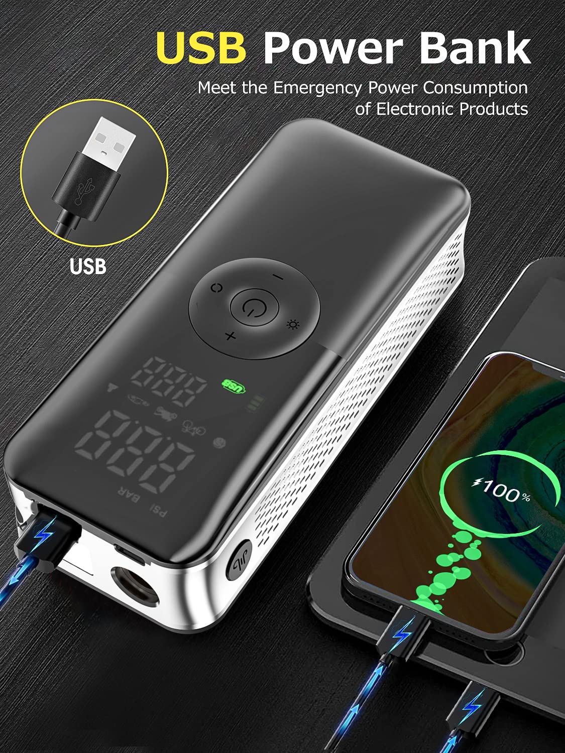 Pompe 150 Psi Usb-c Power Bank Pompe à Air Électrique Portative Pour Vélos – 7.4V, Arrêt Auto (3-150 PSI), écran LCD, Rechargeable USB-C, Power Bank Pompe électrique LED Modes Prédéfinis