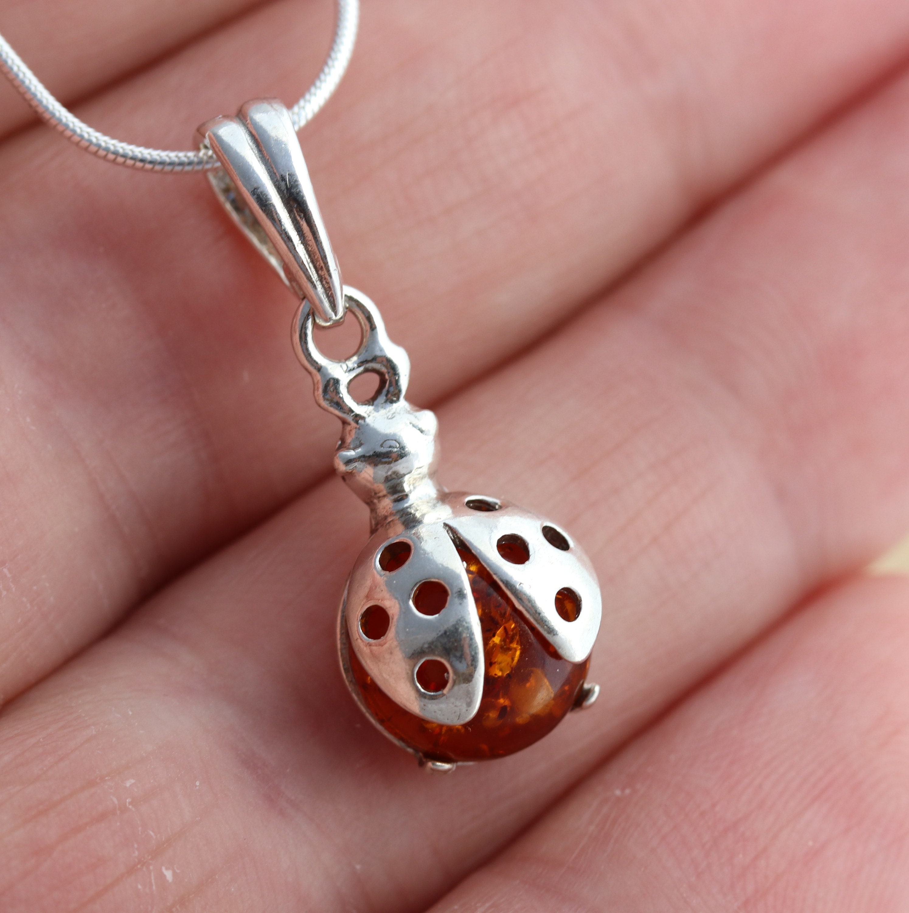 Pendentif Coccinelle En Argent Sterling 925 Et Ambre Baltique - Chaîne 45,7 Cm Incluse, Fait Main Pologne
