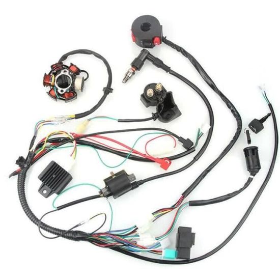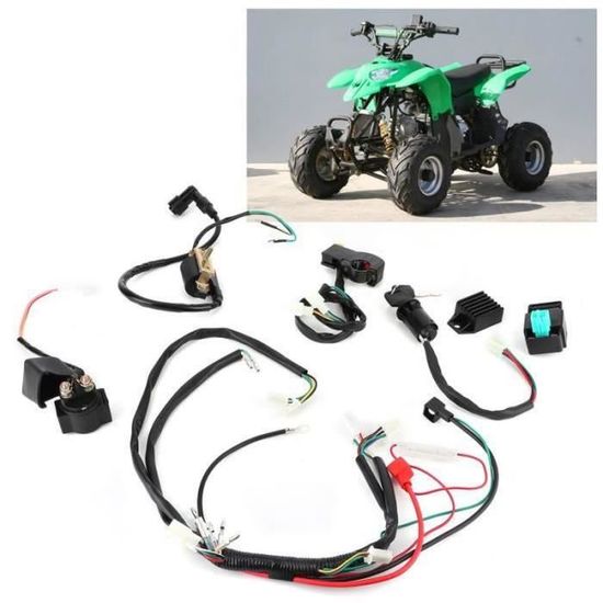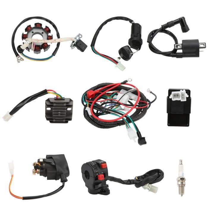 Ton quad 50cc, 70cc, 90cc, 110cc ou 125cc a des problèmes d'allumage ou de démarrage électrique ? Ce kit de câblage CDI complet pourrait bien le remettre sur pied. Il contient tout ce qu'il faut : un faisceau de câbles principal, un boîtier CDI, un stator de volant magnétique, un commutateur de tableau de bord, un interrupteur avec 2 clés, un redresseur et un solénoïde. C'est un kit 12V conçu pour les quads avec démarreur électrique. Les pièces sont en plastique technique résistant à la chaleur et en métal, donc assez durables. En installant ça, tu devrais retrouver un allumage stable, un démarrage plus facile et une conduite plus fluide, sans les limitations de régime que peut causer un CDI fatigué. Bien sûr, il faut un minimum de connaissances en mécanique pour l'installer, ou alors confier le travail à un pro. Si ton quad a des soucis électriques ou si tu fais une restauration, ce kit est une bonne base. Pense à vérifier la compatibilité avec ton modèle exact avant de commander !