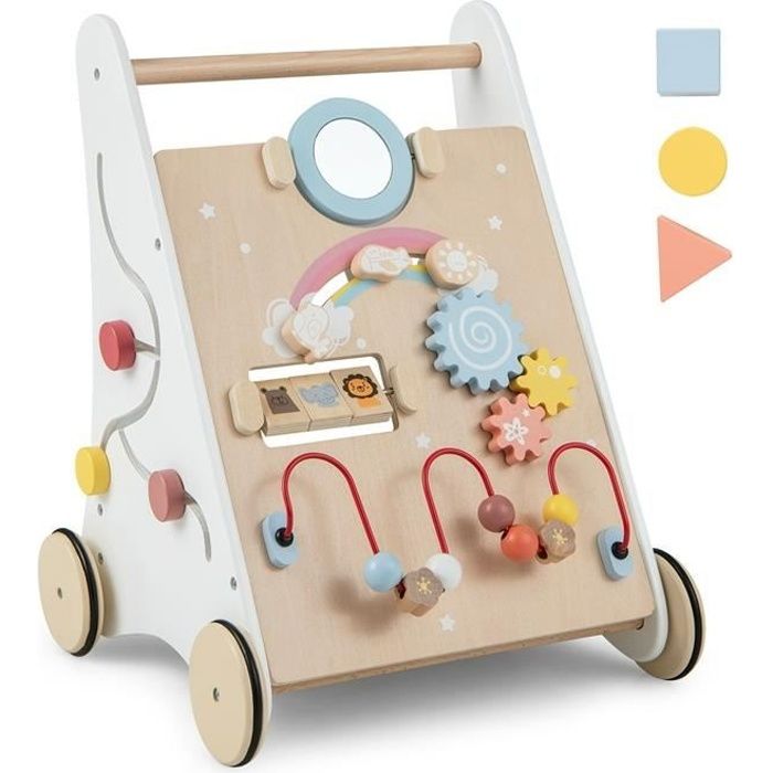 Un jouet qui grandit avec ton bébé, de ses premiers éveils à ses premiers pas ? Ce chariot de marche en bois 8-en-1 est une petite merveille ! Dès 3 mois, bébé peut jouer avec les activités sur le plateau (xylophone, puzzle, engrenages…). Puis, vers 9-12 mois, il se transforme en trotteur stable pour l'aider à marcher. Un jouet intelligent et évolutif ! 👶🚶♂️\n\n**Les 8 activités** :\n1. Xylophone à 5 notes (éveil musical)\n2. Puzzle à rabats (logique)\n3. Horloge avec miroir (découverte de soi)\n4. Tambour (rythme)\n5. Engrenages rotatifs (cause à effet)\n6. Blocs numériques amovibles (apprentissage des chiffres)\n7. Parcours à billes (motricité fine)\n8. Blocs de formes (couleurs et formes)\n\n**Caractéristiques** :\n- Matériau : bois solide, peinture non toxique\n- Dimensions : 33 x 31 x 52 cm\n- Roues : en caoutchouc silencieuses et antidérapantes\n- Structure : triangulaire pour une stabilité optimale\n- Tranche d'âge : de 3 mois à 2 ans environ\n\n**Avantages** :\n- Stimule la motricité fine et globale\n- Encourage la marche en sécurité (ne favorise pas les jambes arquées)\n- Nombreuses activités pour éviter la lassitude\n- Design mignon et coloré\n\n**Montage** : nécessite un assemblage (notice et vis fournies). Un cadeau de naissance, de Noël ou d'anniversaire ultra complet et apprécié par les parents !