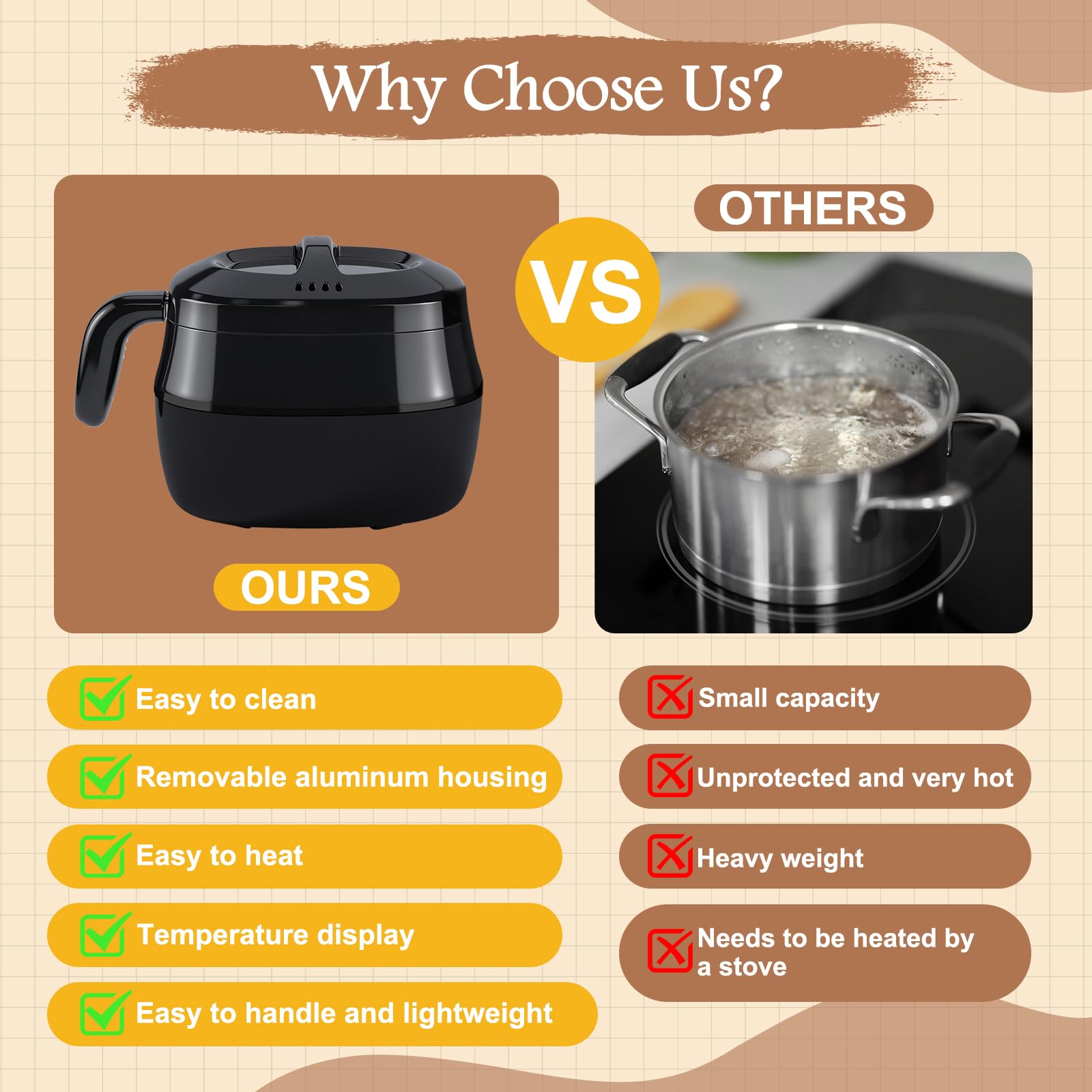 Coucou les créatifs ! Ce fondoir à bougies électrique Yuning est parfait pour vos projets DIY. Avec son réservoir de 1 litre et sa puissance de 100W, il fait fondre la cire (de soja, d'abeille, paraffine, coco…) en 5 à 10 minutes seulement. L'écran LED numérique permet de contrôler la température avec précision (jusqu'à 120°C) – plus de surchauffe ou de cire mal fondue. La poignée en silicone anti-brûlure et les trous de ventilation assurent la sécurité. Le pot intérieur est amovible, avec un bec verseur pratique. Le kit est complet : le fondeur, 100 mèches, 100 autocollants de mèche, 10 outils de centrage et une cuillère de mélange. Même les débutants s'en sortent facilement. Parfait aussi pour faire fondre du chocolat, du savon, ou créer du rouge à lèvres. Un cadeau génial pour les amateurs de loisirs créatifs. Prise UE incluse. Laissez parler votre imagination !