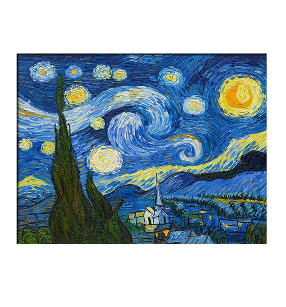 Tu aimes les activités manuelles relaxantes ? Ce kit de broderie diamant (diamond painting) reproduit le célèbre \Ciel étoilé\ de Van Gogh en 70x55cm. Tout est fourni : toile pré-collante, diamants ronds par couleur, stylo, plateau et pince.