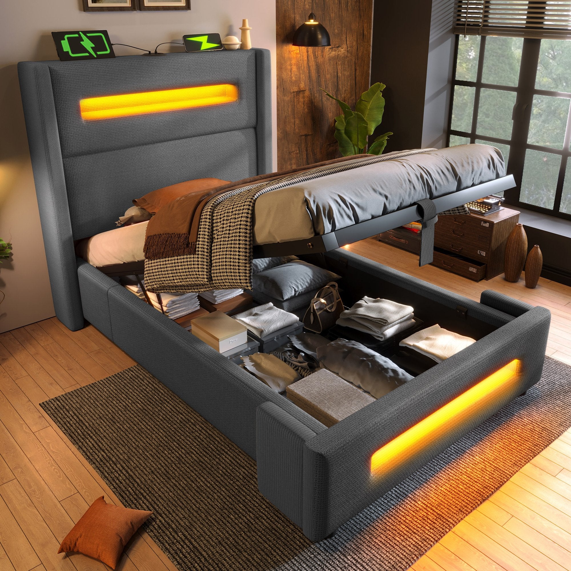 Lit Coffre Enfant 90x200 Avec Rangement - Tête De Lit Capitonnée Réglable - LED USB - Sans Matelas - Beige