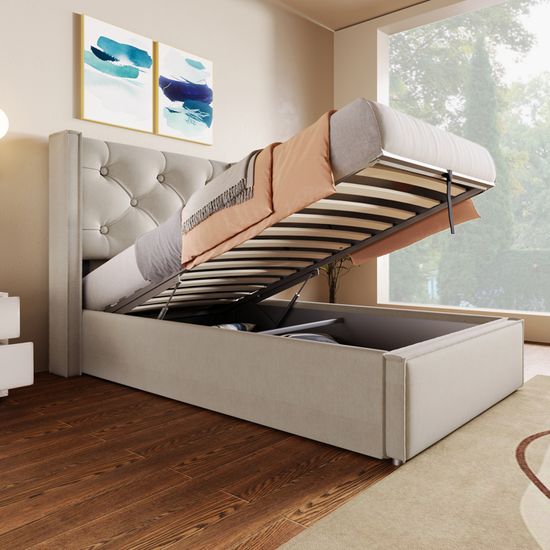 Ce lit coffre 90x200 est une super solution pour gagner de la place dans une chambre d'enfant, d'ado, ou même pour un adulte ! Sous le sommier, un grand coffre de rangement intégré permet de ranger couvertures, jouets, vêtements hors-saison... La tête de lit est capitonnée en velours beige (très doux) et sa hauteur est réglable. Le gros plus : une bande LED intégrée, contrôlable par télécommate, pour créer une ambiance cosy (alimentation par USB ou Type-C). Le cadre est en bois et métal, supportant jusqu'à 150 kg. Dimensions : 214 x 94.5 x 104.5 cm (pour un matelas 90x200 cm, non inclus). Un peu de montage est nécessaire, mais tous les accessoires sont fournis. Design moderne et fonctionnel, parfait pour optimiser l'espace sans sacrifier le style.