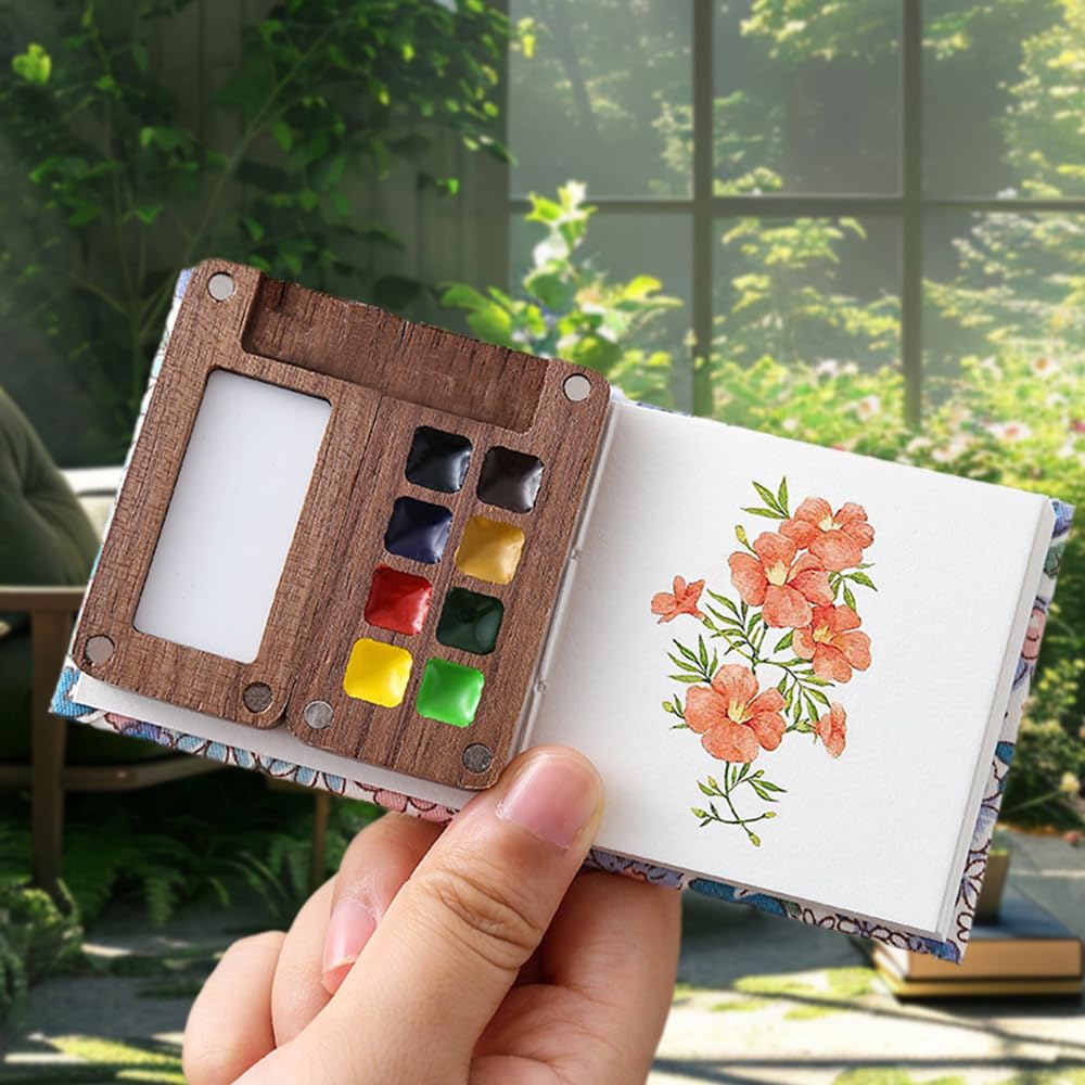 Un kit d’aquarelle ultra compact pour peindre où vous voulez ! Il comprend une palette en bois (noyer) avec 8 compartiments vides (à remplir avec vos propres pigments), un petit carnet de papier aquarelle, 3 pinceaux de tailles différentes et un clip en métal. Le tout tient dans la paume de la main, donc c’est parfait pour les voyages, les croquis en extérieur, ou les pauses créatives improvisées. La palette a un système magnétique qui se fixe au carnet avec le clip pour plus de stabilité. Les matériaux sont de bonne qualité : bois facile à nettoyer, papier qui ne gondole pas trop, pinceaux en nylon. Idéal pour les artistes nomades, les débutants, ou comme cadeau pour un amateur d’art. Attention, les pigments ne sont pas inclus, donc il faut les ajouter vous-même (aquarelle en tubes ou godets). Un petit compagnon créatif, malin et vraiment portable.