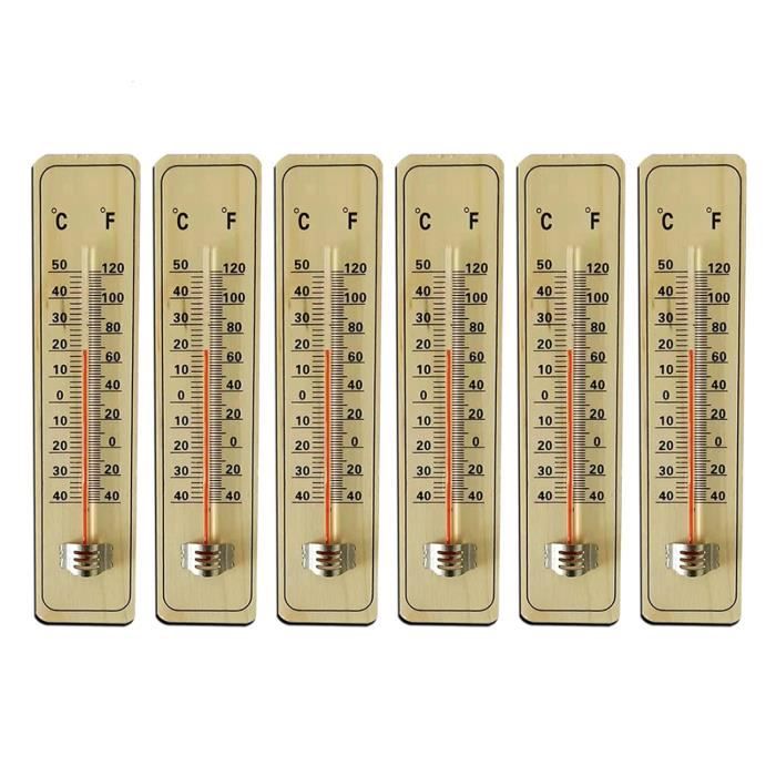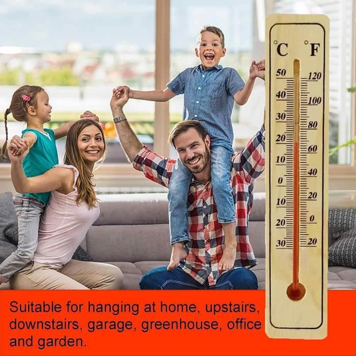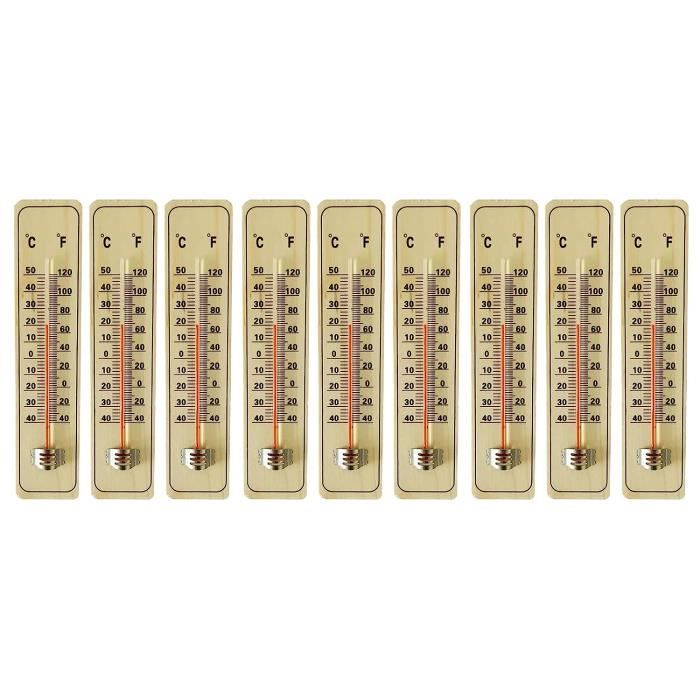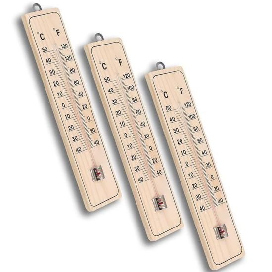 Besoin de thermomètres simples et fiables ? Ce lot de 5 thermomètres en bois est parfait ! Plage de mesure : -40°C à +50°C (et -40°F à +120°F). En bois de pin, dimensions environ 22 x 4 cm. Lecture claire en Celsius et Fahrenheit. Avec un trou pour les suspendre facilement. Idéal pour l'intérieur (maison, bureau) ou l'extérieur (garage, serre, jardin). Les acheteurs les trouvent précis et décoratifs. Un excellent rapport qualité-prix. Mesure la température partout où tu veux !