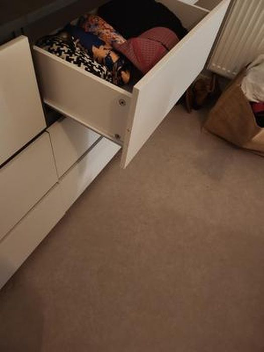 Les poignées intégrées sont discrètes et pratiques - pas d'accrochage aux vêtements. Les glissières coulissent bien, même quand les tiroirs sont pleins.