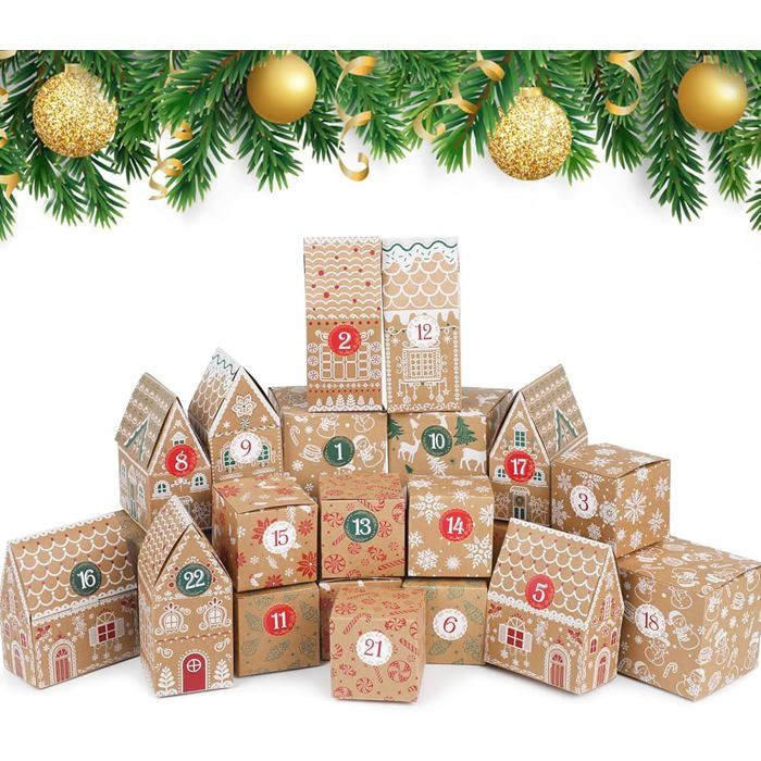 Tu prépares des petits cadeaux, des bonbons ou un calendrier de l'Avent maison ? Ces boîtes en papier kraft sont parfaites ! Le lot comprend 24 boîtes avec 8 motifs différents sur le thème de Noël (sapins, rennes, bonhommes de neige…). Chaque boîte mesure environ 12 cm de long, 7,2 cm de large et 2,5 cm de haut, assez spacieuse pour des chocolats, des bijoux, des petits jouets. En papier kraft épais et résistant, elles sont aussi écologiques. Tu peux les assembler facilement (elles sont plates à l'arrivée) et les remplir de surprises. Idéales pour décorer le sapin, organiser un jeu de piste ou offrir de petites attentions. Une valeur sûre pour les fêtes créatives en famille !
