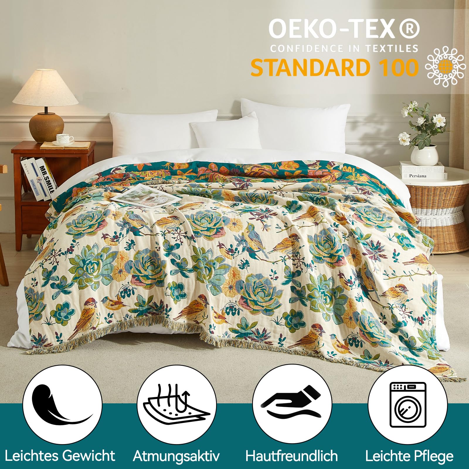 Cette grande couverture en coton 100% va réchauffer et décorer votre salon ou chambre. Dimensions généreuses : 230 x 250 cm, elle couvre un lit double ou se drape magnifiquement sur un canapé. Le tissu est doux, respirant, agréable au toucher. Le design boho patchwork avec des motifs verts et beiges est tendance et s'adapte à beaucoup de décors intérieurs (scandinave, naturel, ethnique…). Elle est double face, donc vous pouvez la retourner selon votre humeur. Lavable en machine à 30° (un peu de rétrécissement possible, c'est normal pour le coton). Parfaite pour s'emmitoufler devant un film, pour un pique-nique, ou comme couvre-lit décoratif. Un article à la fois pratique et esthétique, qui apporte une ambiance chaleureuse. En pure coton, elle convient même aux peaux sensibles.