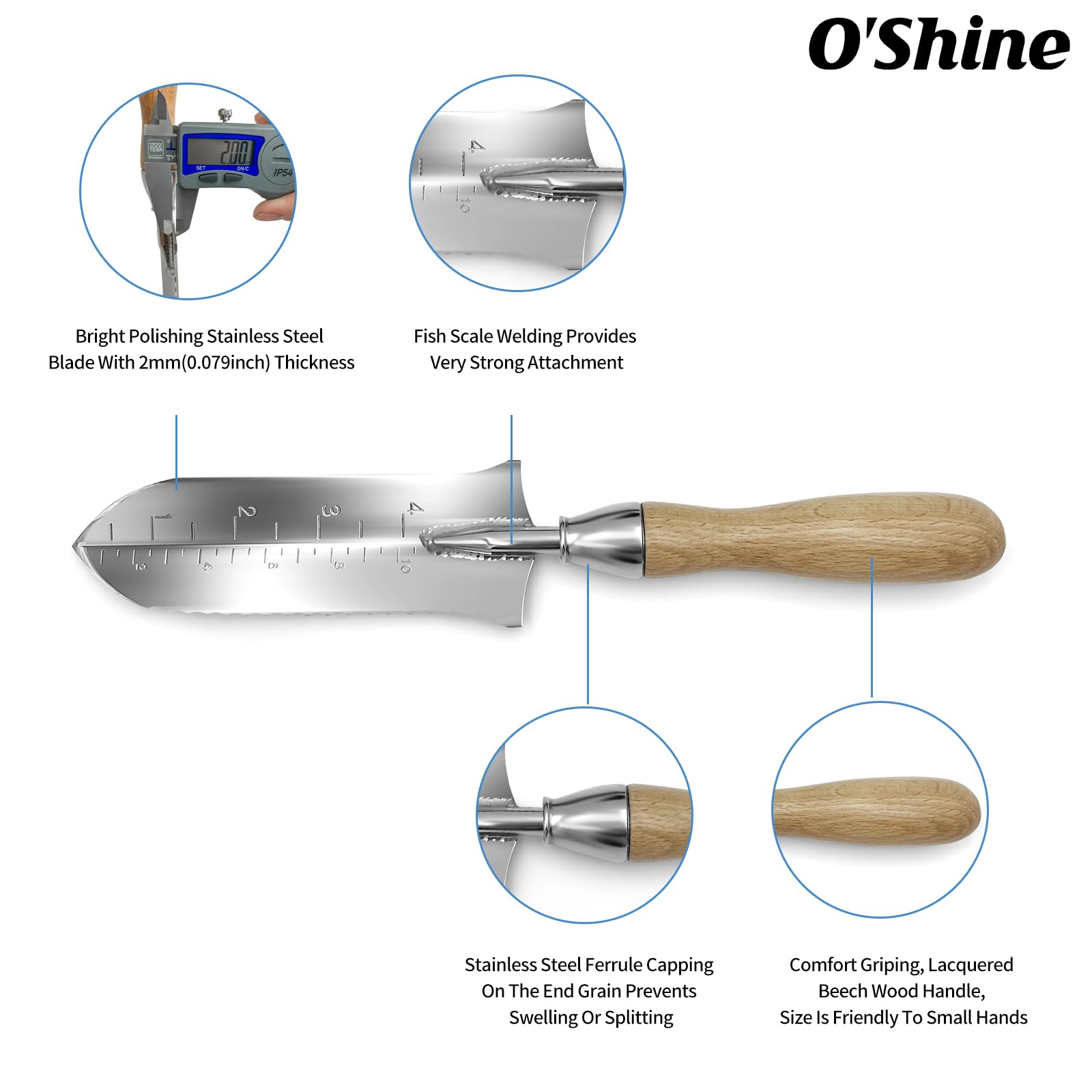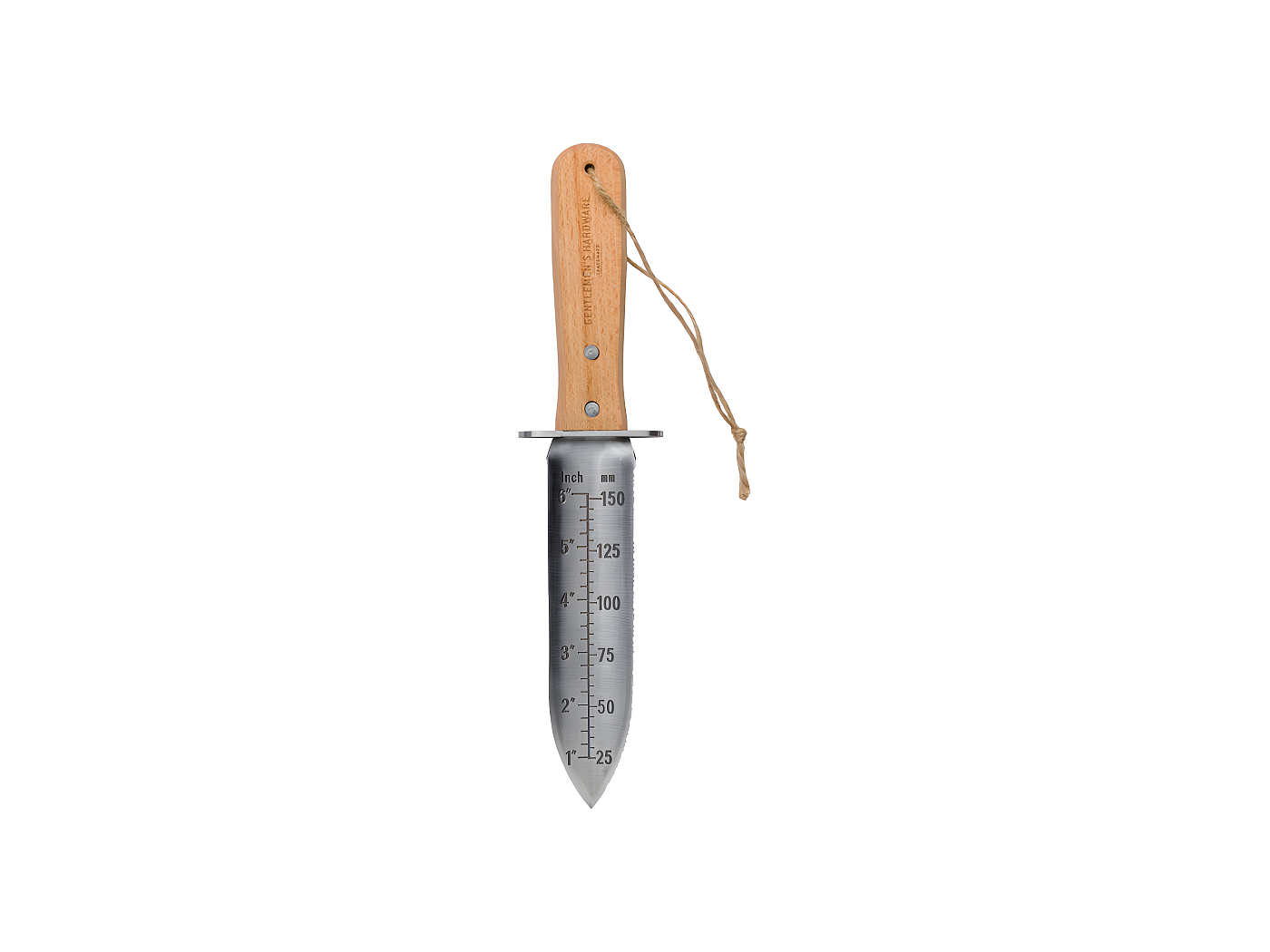 Les graduations gravées sur la lame te permettent de mesurer la profondeur de plantation (en cm et pouces). Le manche rond en hêtre est confortable en main, et il est livré avec un étui en cuir PVC pour le ranger à ta ceinture ou le protéger.