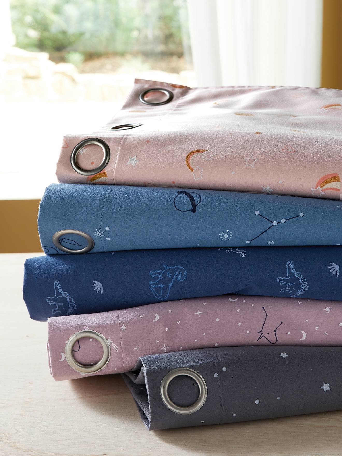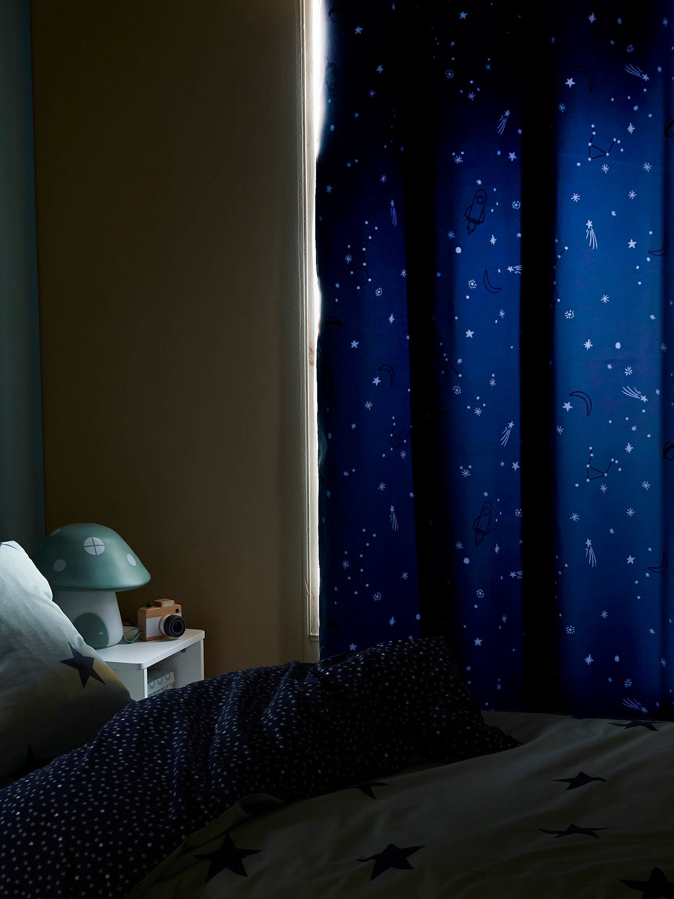 Un rideau qui fait rêver les enfants ! La journée, c’est un joli rideau arc-en-ciel avec des étoiles. La nuit, les étoiles deviennent phosphorescentes et brillent dans le noir – magique !