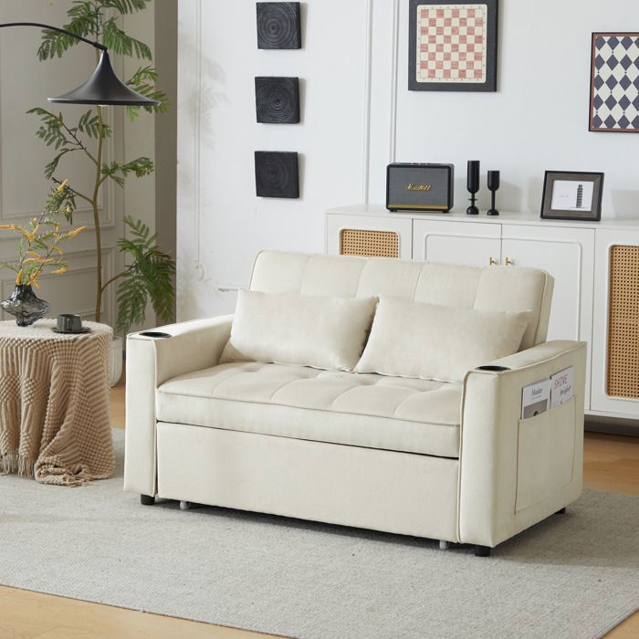 Besoin d'un canapé confortable pour le salon qui se transforme en lit d'appoint pratique ? Ce canapé deux places en velours jaune est la solution parfaite pour les petits espaces ou les studios. Ses deux dossiers s'inclinent indépendamment (3 positions), pour que chacun trouve sa position idéale pour lire, regarder la TV ou se reposer. Les accoudoirs ont aussi 6 niveaux de réglage, pouvant même servir de tablettes. Et le clou du spectacle : en rabattant complètement les dossiers et accoudoirs, vous obtenez un lit spacieux de 215 x 81.5 cm ! Le velours est doux, résistant et facile à entretenir. La structure en bois et la mousse haute densité assurent un bon maintien et une longue durée de vie (charge max 150 kg). Les pieds métalliques dorés surélèvent le meuble pour un nettoyage facile dessous, et le look moderne avec coussins décoratifs s'intègre dans beaucoup de décors. Montage simple, gain de place assuré. Idéal pour un salon, une chambre d'ami ou un bureau à la maison.