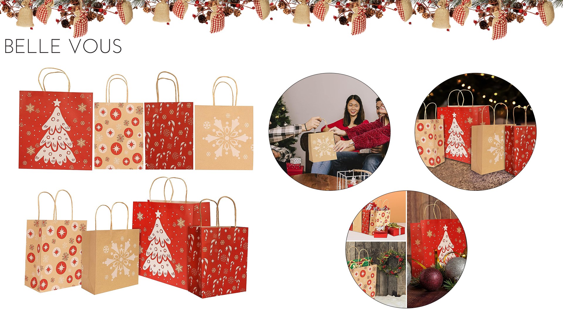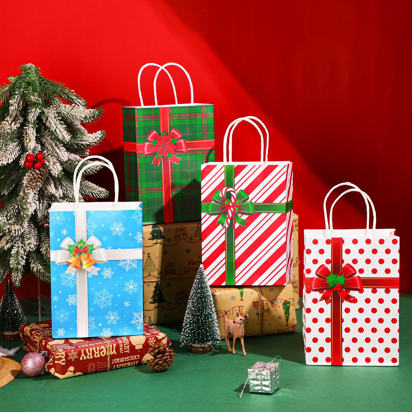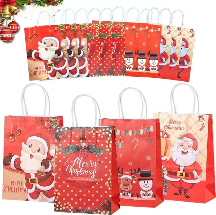 Sacs-cadeaux Noël En Papier Kraft – Lot De 24 Sacs Avec Poignées – Format 21x15x8 Cm – Pour Emballages Cadeaux Festifs