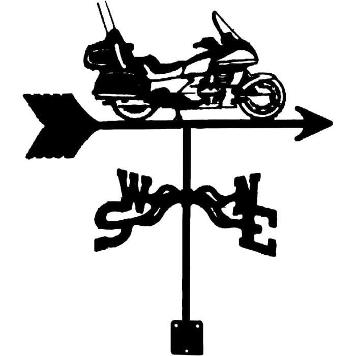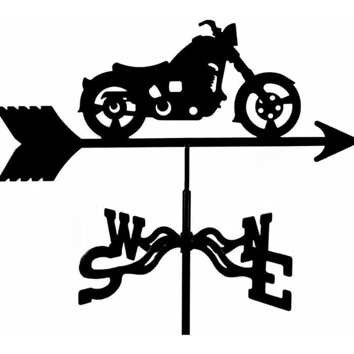 Donnez du caractère à votre jardin avec cette girouette en forme de moto ! En acier inoxydable de qualité, elle résiste aux intempéries et aux UV. Dimensions : 35 x 50 cm.\n\nElle tourne au moindre souffle de vent, indiquant la direction de manière précise et décorative. Montage simple, sans outil particulier.\n\nIdéale pour fixer sur un toit, un poteau, une terrasse ou un abri de jardin. Design original qui plaît aux passionnés de moto et ajoute une touche ludique à l'extérieur.\n\nRobuste et durable, c'est à la fois un objet fonctionnel et un élément décoratif qui attire le regard. Offrez-vous un peu de mouvement et de style dans votre espace vert !