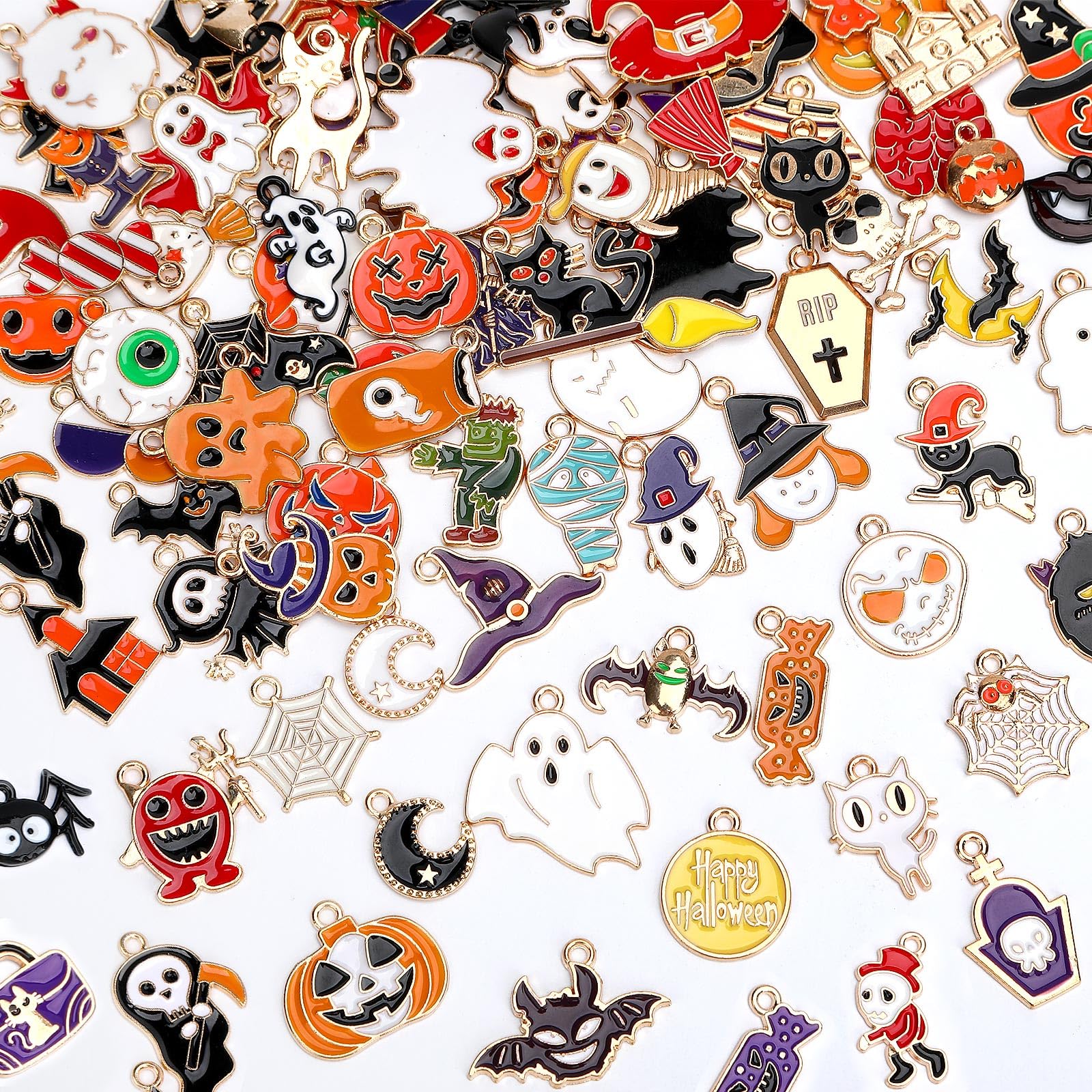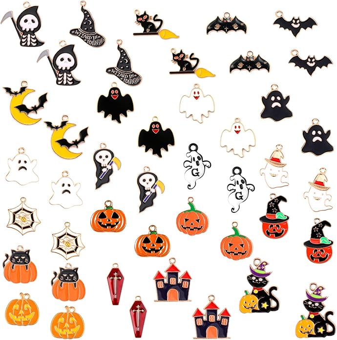 Accessoires Bijoux DIY Halloween Lot De 44 Charms Halloween – Motifs Sorcière, Chauve-souris, Citrouille, Pour Fabrication De Bijoux DIY Kit Création Bijoux Thème