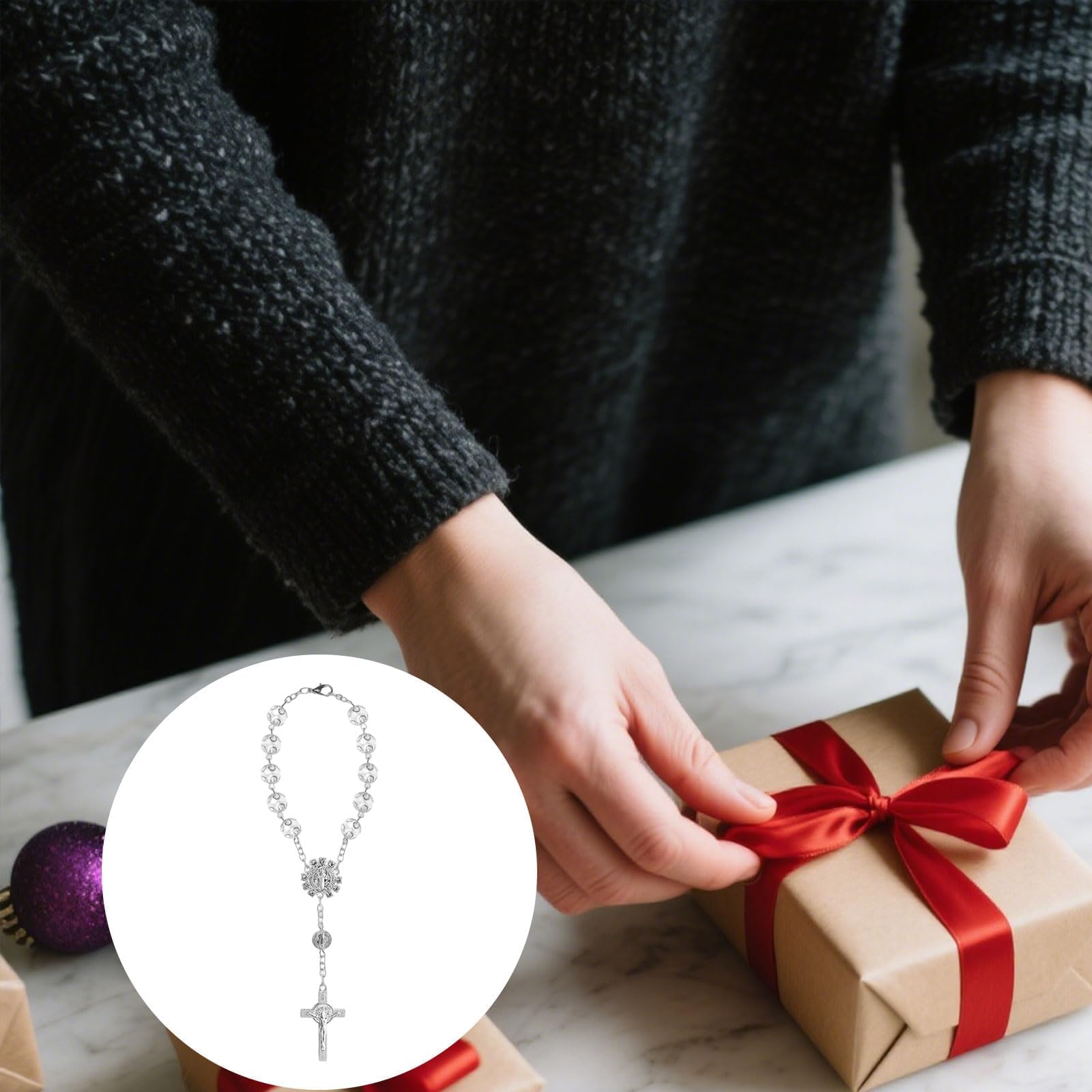 Chapelet Rétroviseur Voiture Avec Saint Christophe - Amulette Porte-Bonheur Pour Conducteur - Cadeau Argenté