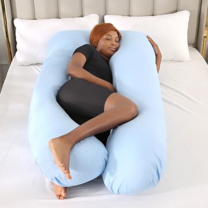 Tu es enceinte et tu as du mal à trouver une position confortable pour dormir ? Ce coussin en forme de U est fait pour toi. Il mesure 80 x 110 x 180 cm, et t’entoure complètement pour soutenir ton ventre, ton dos, tes hanches et tes jambes.\n\nEn polaire doux, il est agréable contre la peau, même en été (il existe aussi en coton selon les modèles). Le rembourrage est ajustable : tu peux ajouter ou enlever de la mousse pour le rendre plus ferme ou plus moelleux.\n\nIl ne glisse pas sur le lit, grâce à sa forme qui épouse ton corps. Tu peux dormir sur le côté, sur le dos, à moitié assise… et même l’utiliser pour allaiter plus confortablement après la naissance.\n\nMais ce n’est pas que pour les femmes enceintes : les personnes avec des douleurs dorsales, les insomniaques, ceux qui aiment s’entourer d’un oreiller géant pour lire ou regarder la TV vont l’adorer aussi.\n\nIl se lave en machine (housse amovible selon le modèle), et retrouve sa forme après quelques heures d’aération. Un vrai cocon de confort, surtout pendant le dernier trimestre de grossesse où le sommeil peut être compliqué.\n\nC’est aussi un cadeau de naissance ultra apprécié. Les futures mamans te remercieront pour ce soutien physique et moral pendant une période parfois fatigante.