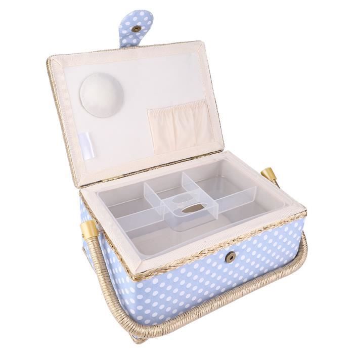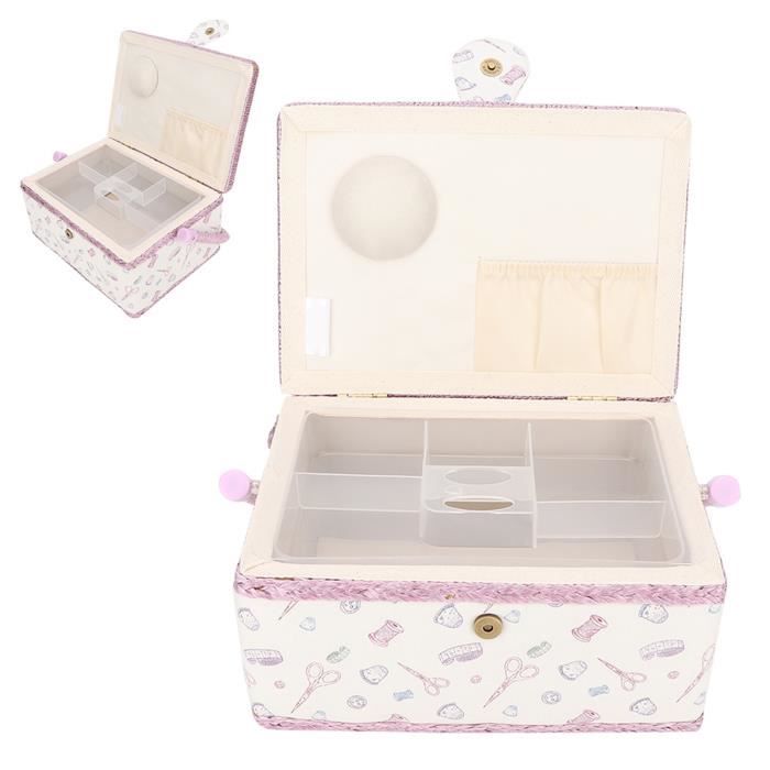 Un panier à couture aussi beau que pratique ! Ce modèle Korbond en tissu rose à petits pois mesure 18 x 36 x 34 cm. Il a une poignée solide pour le transporter facilement dans la maison ou en atelier. À l’intérieur, un plateau en plastique transparent avec compartiments (2 grands, 7 petits) pour ranger bobines, aiguilles, épingles, boutons… rien ne se perd. Sous le couvercle, un coussin à épingles de 8x8 cm et une poche de 15x14 cm sont fixés. Super pour garder ton matériel de couture ou de broderie bien organisé. En plus, il décore ta pièce avec son style rétro. Que tu sois débutante ou experte, ce panier devient indispensable. Parfait pour offrir à une amie créative ou pour s’offrir un rangement chic. On adore !