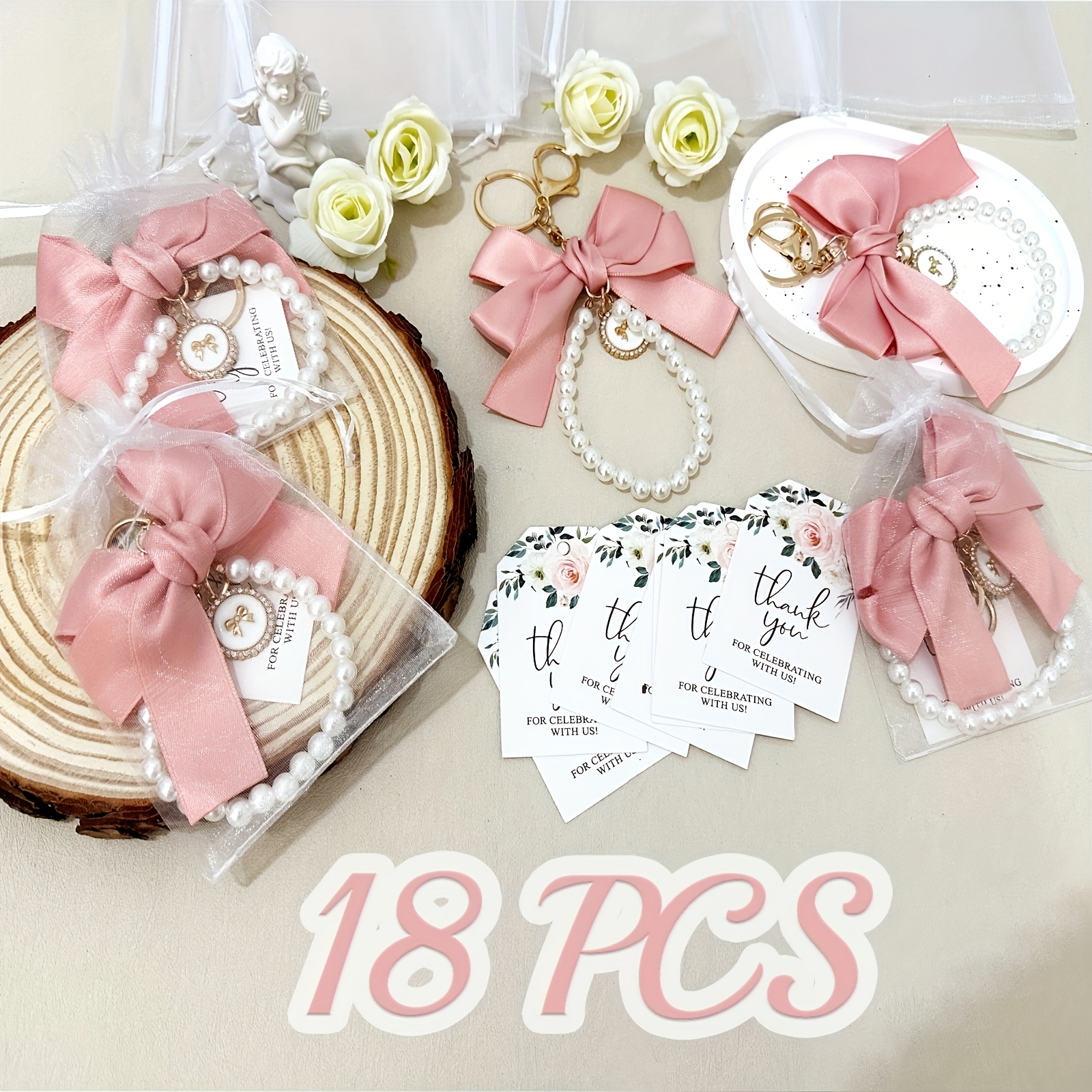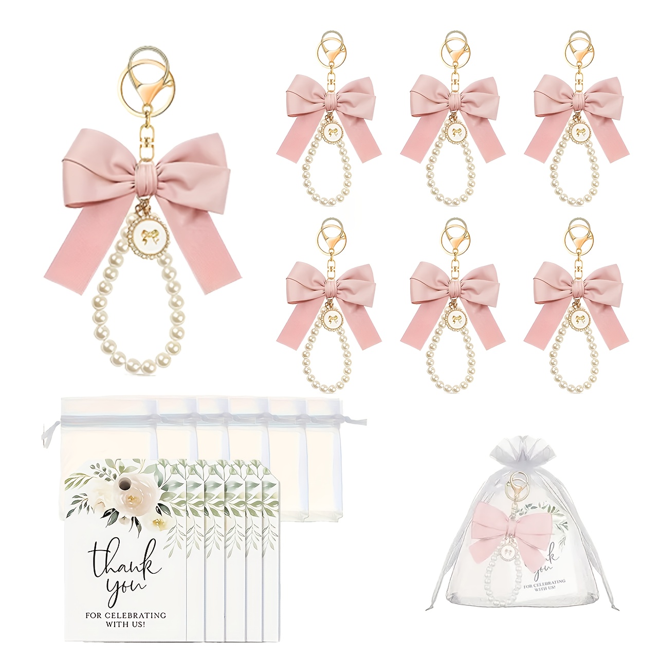 Cadeau Invités événement 20 Ensembles Porte-clés Nœud Perles + Cartes + Sachets Organza - Cadeaux Mariage, Fête, Remerciement - Kit Complet Cadeaux Invités Mariage Anniversaire