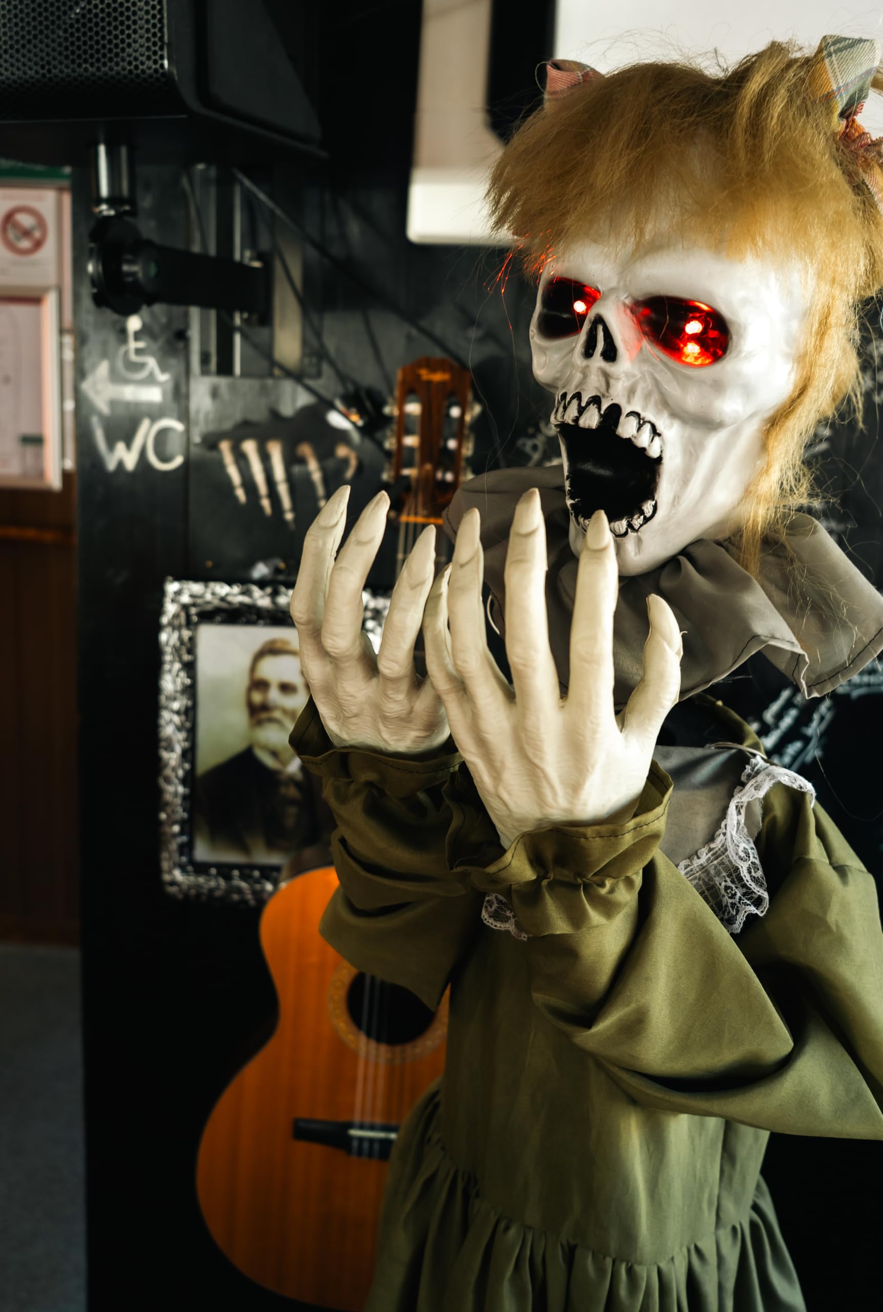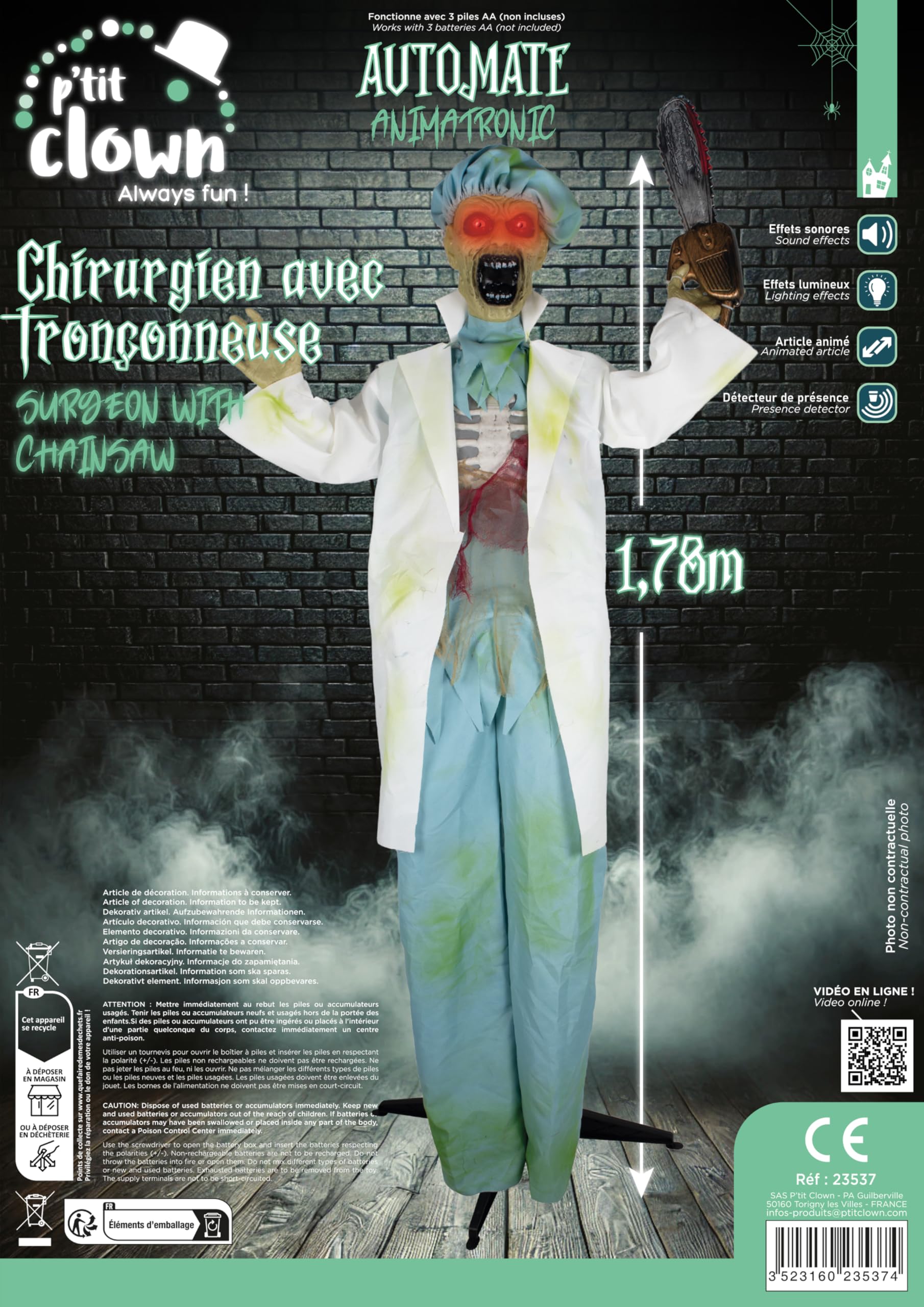 Salut les fans de frissons ! Pour Halloween, tu veux vraiment impressionner tes invités ? Cet automate animatronique « Monstre bossu » de 160 cm est juste terrifiant. Il combine mouvement, son et lumières pour créer une ambiance de maison hantée ultra immersive. Dès que quelqu’un passe à proximité, il s’active – yeux lumineux, rires inquiétants, mouvements saccadés… ça fait son effet à coup sûr ! Il fonctionne avec des piles AA (non fournies), donc tu peux le placer où tu veux, sans prise électrique : dans l’entrée, un couloir sombre, une vitrine, ou même sous un abri dans le jardin (évite la pluie directe). Les détails sont réalistes et usés, les vêtements ajoutent au côté sinistre. Tu peux l’utiliser seul pour un point d’horreur, ou le combiner avec d’autres automates pour une scénographie d’ensemble encore plus flippante. C’est simple à installer, sans outils, et la qualité est aux normes européennes de sécurité. Que tu organises une fête d’Halloween, une soirée à thème, ou que tu veux juste surprendre les passants, ce monstre bossu va marquer les esprits. Attention, les enfants sensibles pourraient avoir peur – mais c’est un peu le but, non ? Prépare-toi à des cris et des rires nerveux… une décoration qui garantit des souvenirs mémorables !