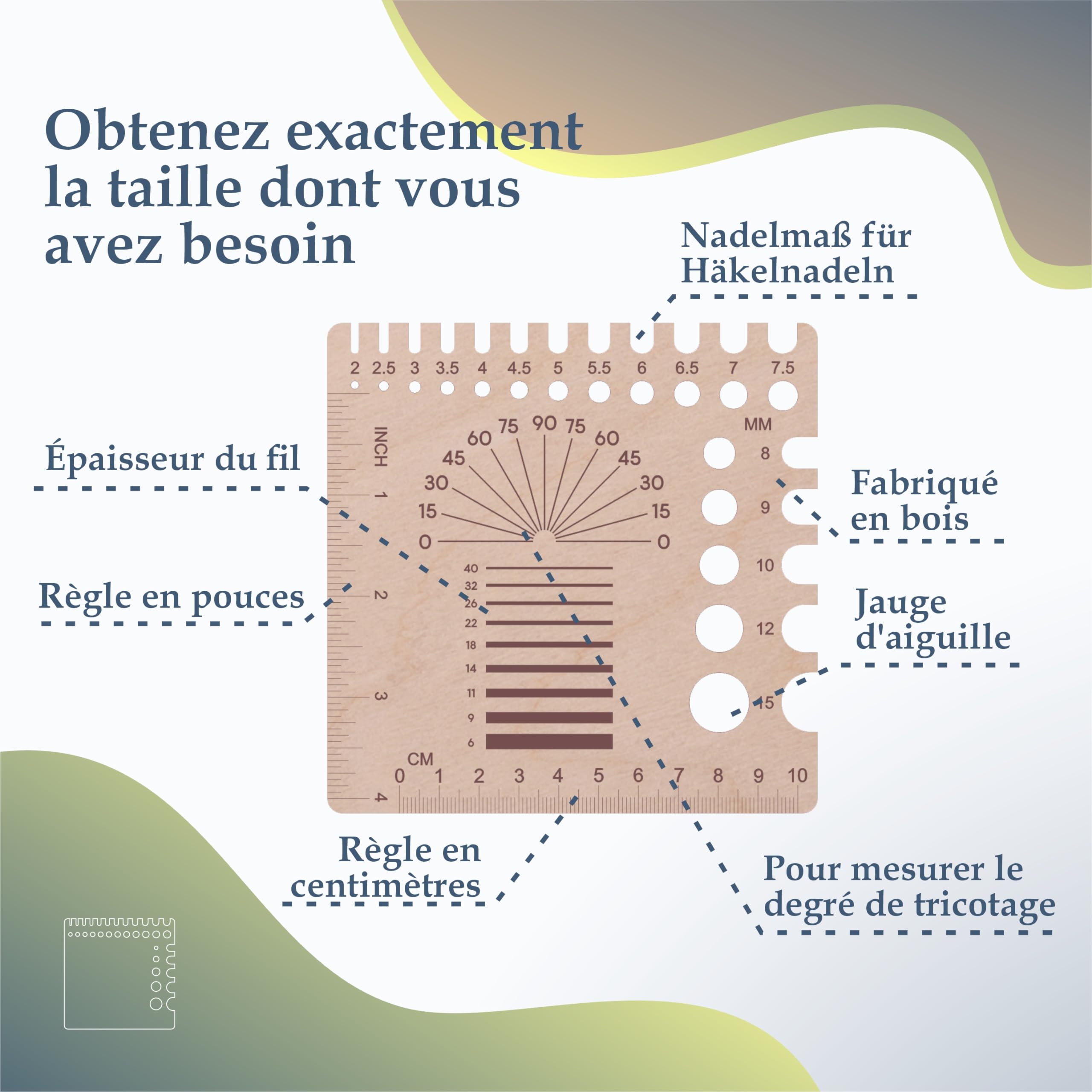 Tu es tricoteuse ou crocheteuse et tu as toujours du mal à identifier le diamètre de tes aiguilles ou crochets, surtout ceux qui n'ont pas de numéro gravé ? Cette jauge en bois est l'outil indispensable ! C'est une petite plaque carrée de 15x15 cm, épaisse et solide, avec une série de trous calibrés de 2 à 15 mm. Tu insères ton aiguille ou la tige de ton crochet dans les trous jusqu'à trouver celui qui correspond parfaitement, et hop, tu connais sa taille. En plus, elle sert aussi de règle, avec des graduations en centimètres, millimètres et pouces sur les bords, parfaite pour mesurer tes échantillons (mailles/10 cm). C'est un objet simple, bien fabriqué, qui dure dans le temps et qui évite bien des erreurs dans le choix du matériel ou le suivi d'un patron. Un accessoire pas cher mais ultra-utile pour toutes les passionnées de loisirs créatifs, du débutant à l'experte. Un cadeau parfait à offrir ou à s'offrir.